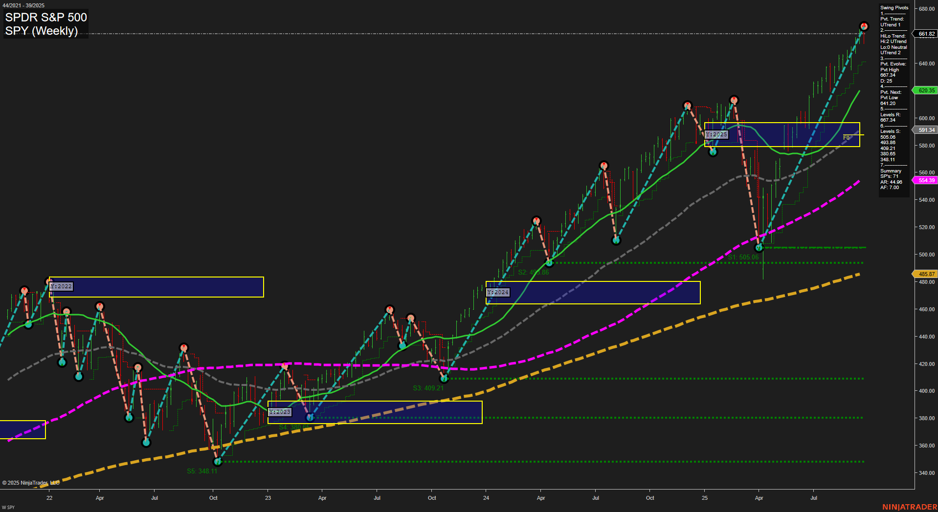 - ES Bullish all HTFs, price above YSFG/MSFG/WSFG, all MAs up, swing pivots confirm uptrend, resistance 6756.75, support 6360.15, structure confirms trend continuation, no exhaustion present.