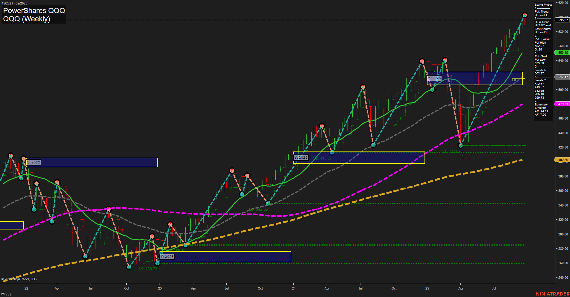 - NQ All-time highs, YSFG, MSFG, WSFG trending upward, recent pivots confirm uptrend, support at 22047.86, above NTZ/F0% levels, MAs rising, momentum phase, intermediate and long-term bullish.