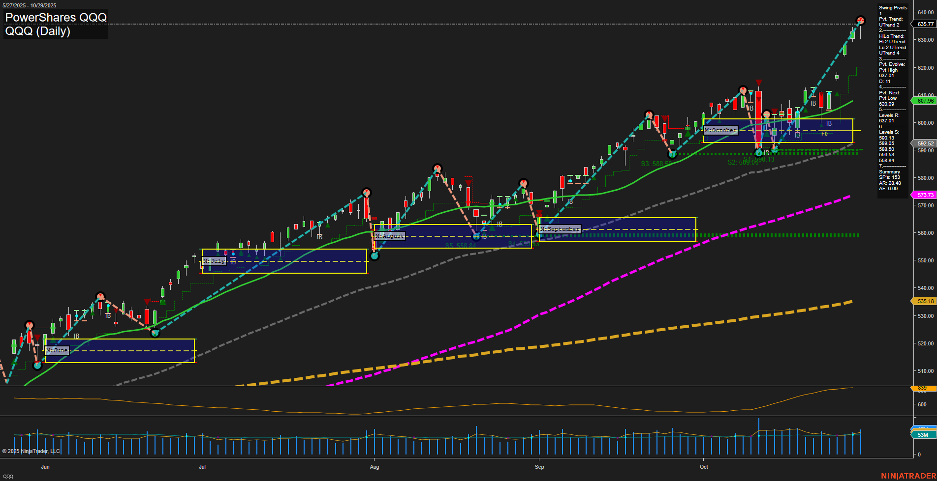 - QQQ: 626.05 (-1.53%) — Tech-heavy ETF extending declines, showing heightened weakness.