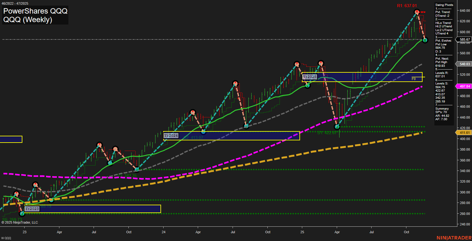 - NQ YSFG and long-term MAs up, MSFG/WSFG down, price below NTZ, swing pivot trend down, support 23904/24176, resistance 25487/26399, corrective phase within long-term uptrend, volatility elevated.