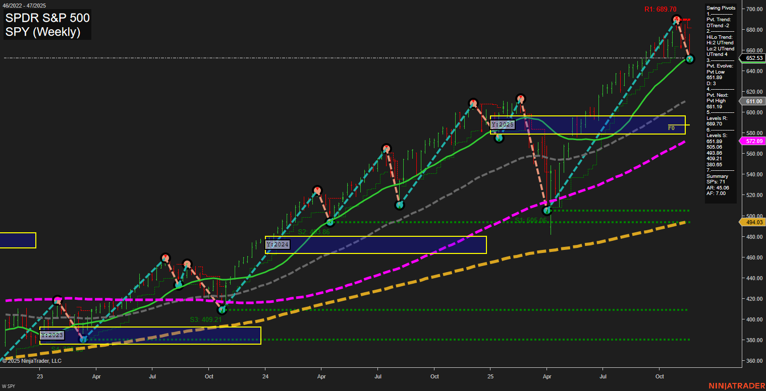 US Indices Futures show pronounced short- and intermediate-term weakness, with all major contracts below key MSFG and WSFG NTZ levels, downward momentum, and prevailing swing pivot downtrends. Major support areas are being tested across indices, while resistance remains layered overhead. Despite the broad downside pressure, YSFG and long-term moving averages generally reflect intact bullish structures for ES, NQ, YM, and FDAX; EMD and RTY show neutral to bearish long-term readings. Recent trade signals highlight mixed activity but agree with the prevailing downtrends. The indices are undergoing corrective phases within larger uptrends (where applicable), with potential for further support tests or consolidation before trend resumption.