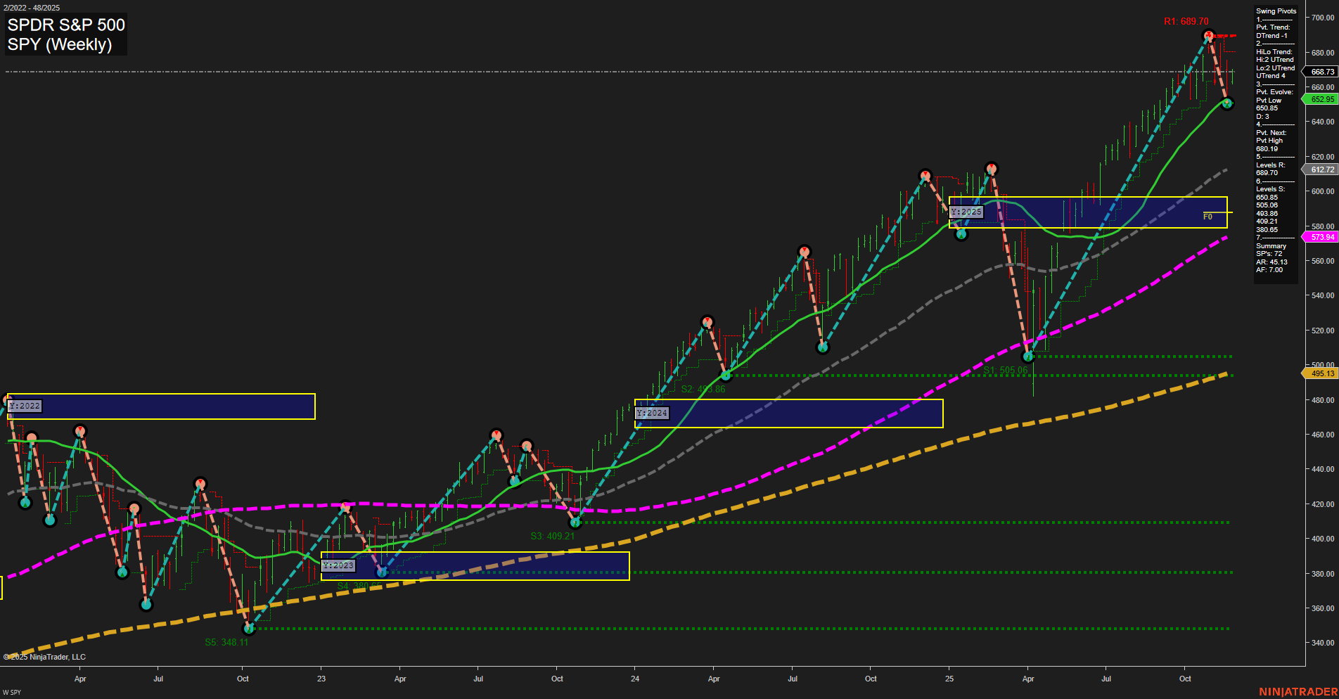 - ES Strong uptrend, all YSFG/MSFG/WSFG up, price above benchmarks, HH/HL pivots, major support 6525.25, resistance 6953.75, structure favoring continuation unless reversal signals emerge.