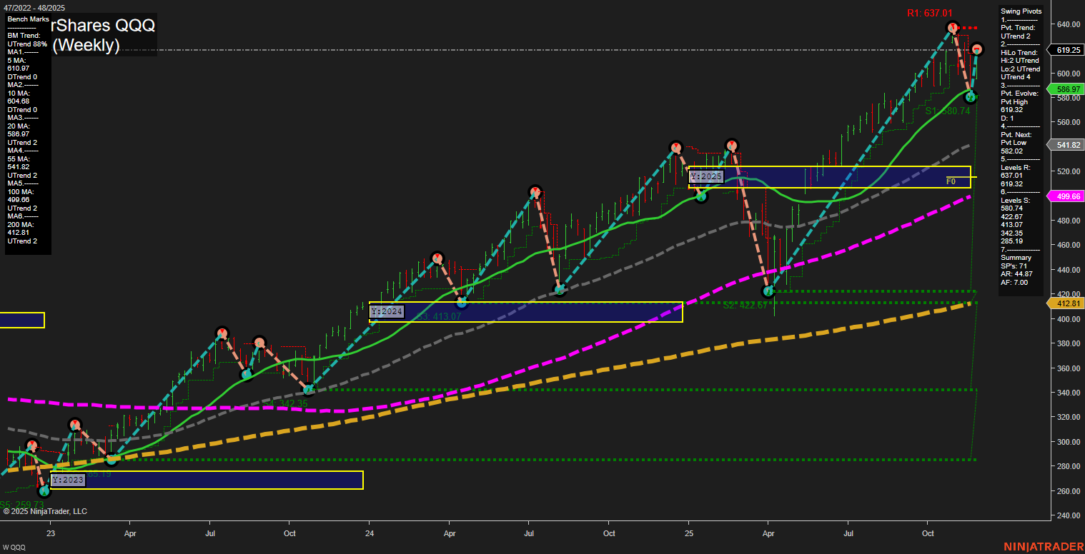 - NQ Weekly YSFG, MSFG bullish, WSFG down, above major MA benchmarks, recent sharp pullback and recovery, swing pivots mixed, S/R: 26399 (res), 23904.50 (sup).