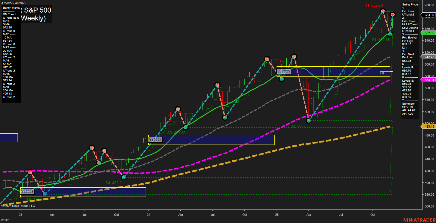 - ES Weekly YSFG, MSFG up, WSFG trend down, price above major MAs, recent highs near resistance, swing pivots up, S/R: 6953.75/6844.50 (res), 6525.00/5182.50 (sup).