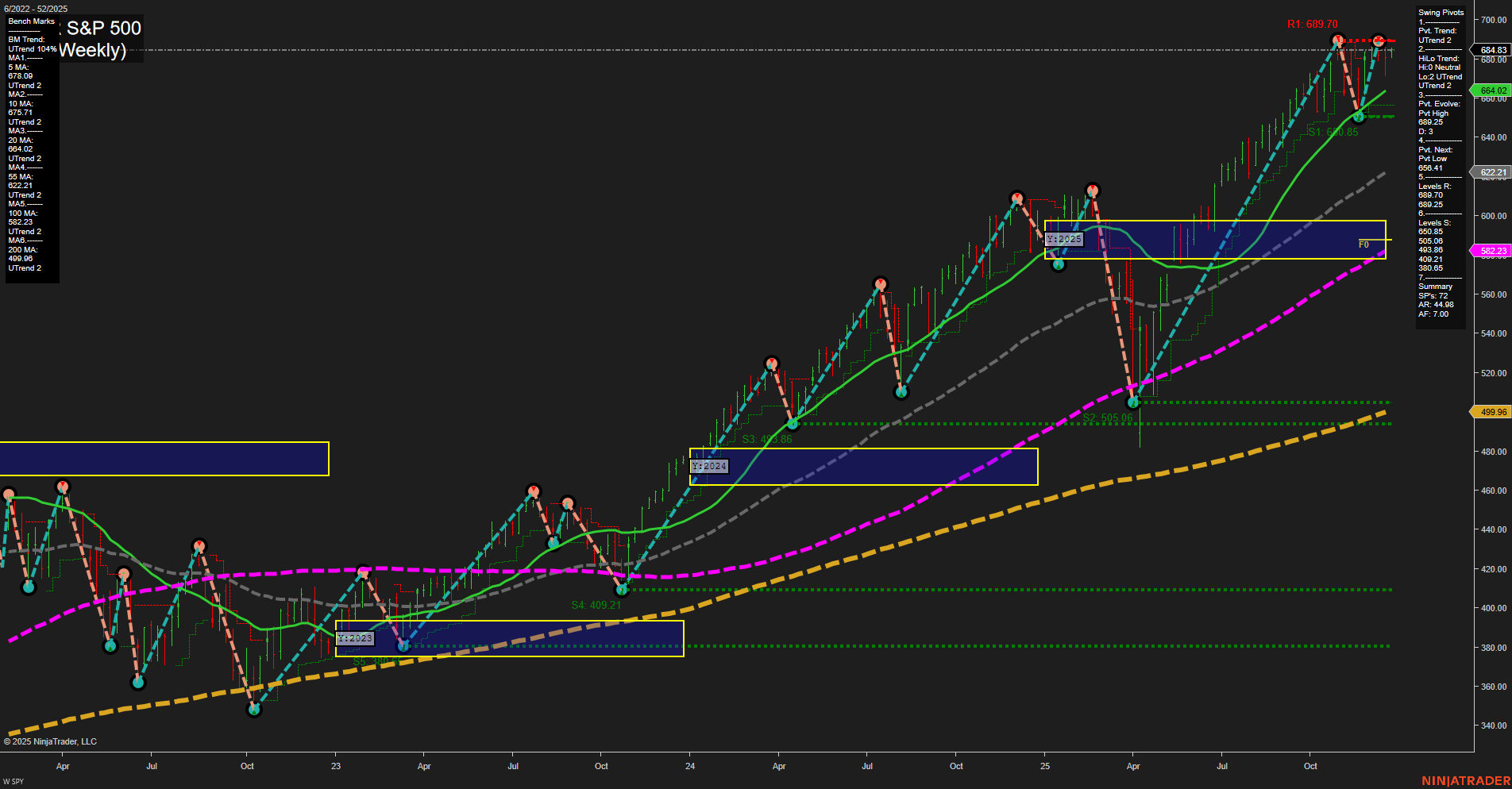 - ES Strong uptrend, price above YSFG/MSFG/WSFG F0%, all benchmarks up, swing pivots up, resistance at all-time high 7013.50, support 6844.75, long signals predominate.