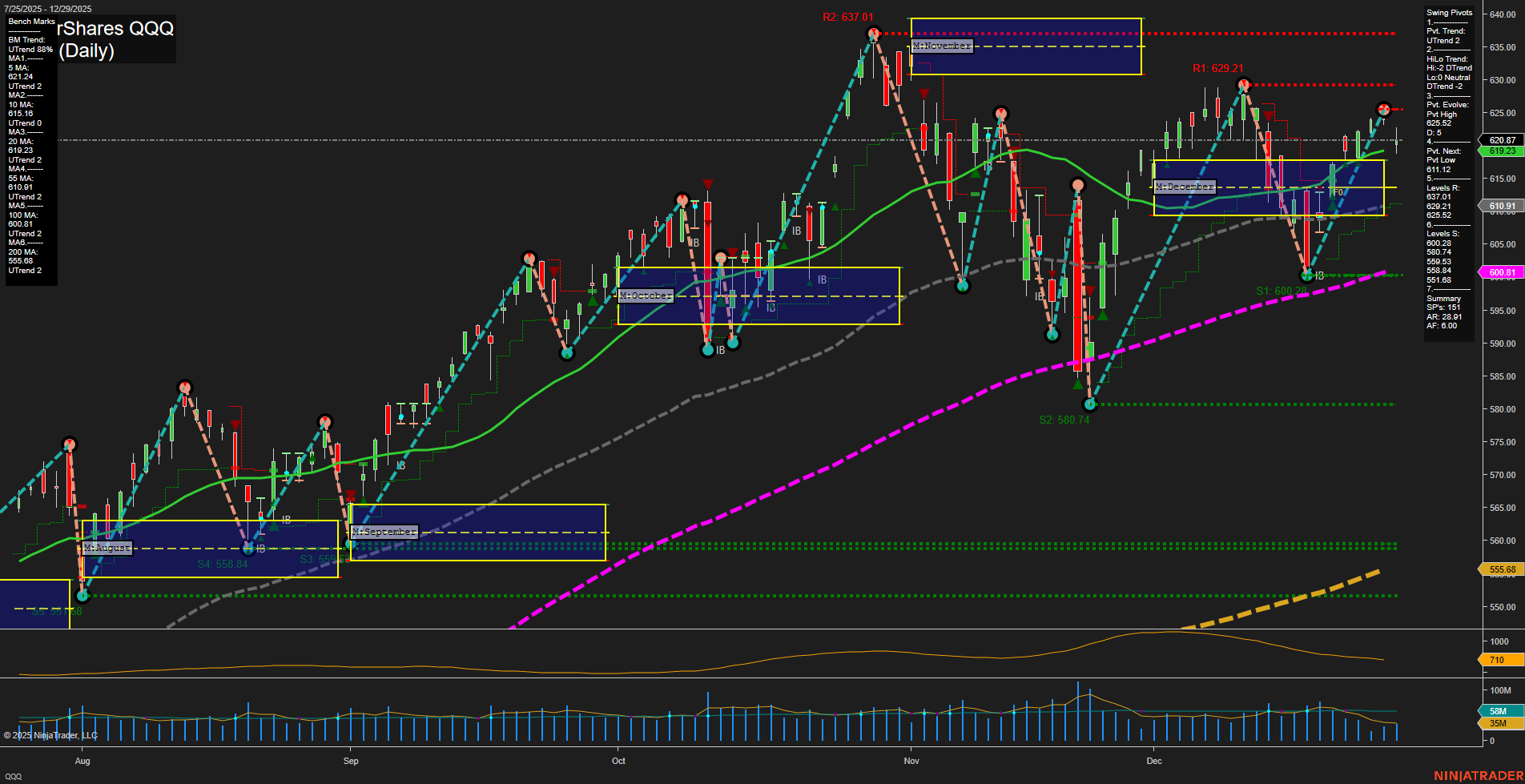 - QQQ 619.43 (Bearish -0.23%) – NASDAQ 100 ETF tilts lower, underlining recent tech retraces.