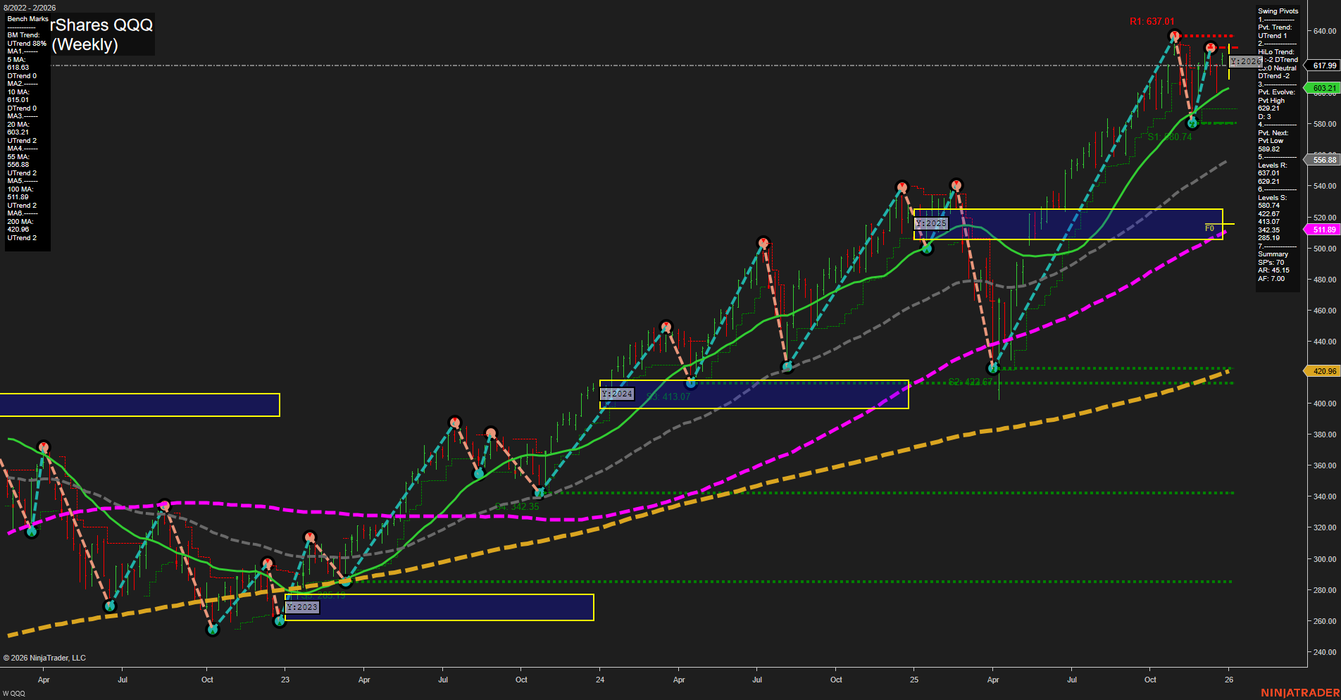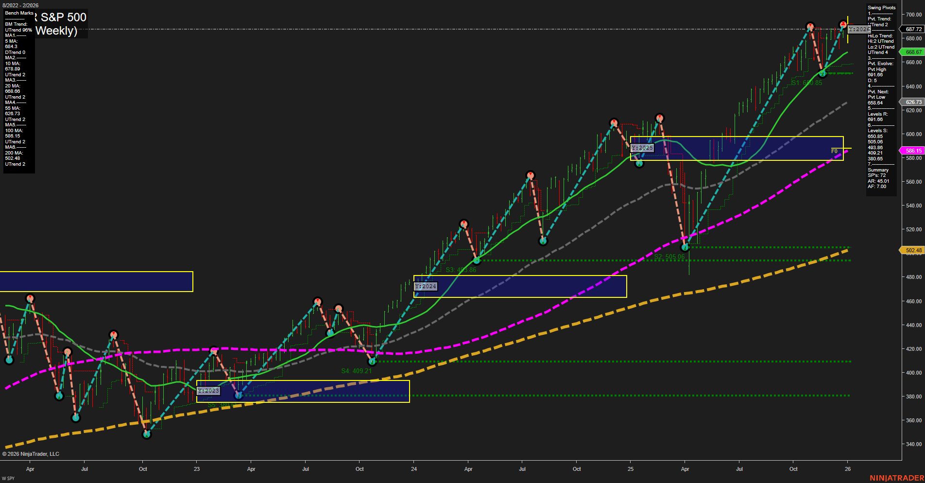 Broad HTF technical structure for US Indices Futures is trending bullish on short- and intermediate-term horizons, with price above major session fib grid levels and all benchmark moving averages rising. Recent swing pivots and long signals confirm uptrends, while higher highs and higher lows persist across most contracts. Main benchmarks (WSFG, MSFG, YSFG) are aligned upward or holding above NTZ for YM, EMD, RTY, FDAX; ES and NQ show minor long-term consolidation under yearly resistance. Support levels are layered beneath recent tops, but no material HTF exhaustion. The current state indicates ongoing trend continuity, with ES and NQ exhibiting more neutral long-term profiles as they approach yearly fib grid ceilings. Directional correlations favor continued upward structure, with all contracts showing structured support and controlled volatility within broad rally phases.
