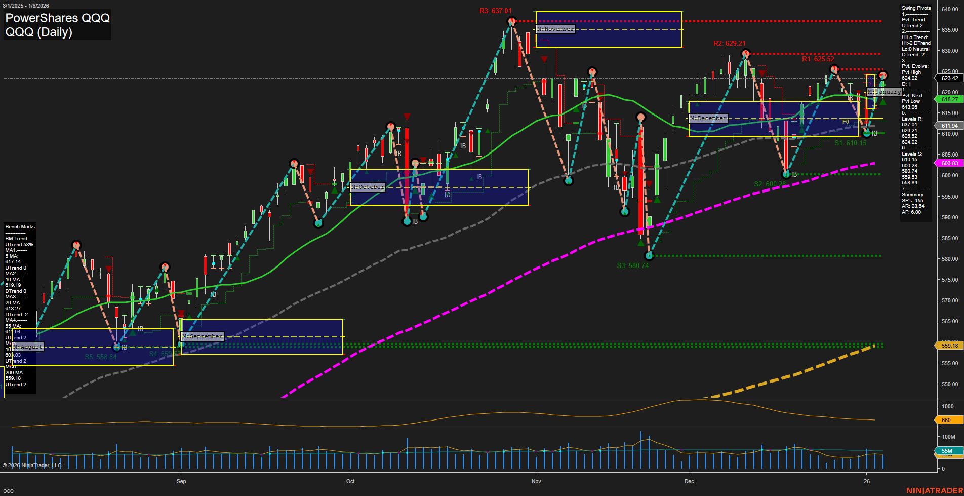 S&P 500 proxy trades slightly lower, reflecting weakness in overall large-cap equities. - QQQ 624.02 Bullish (0.10%)