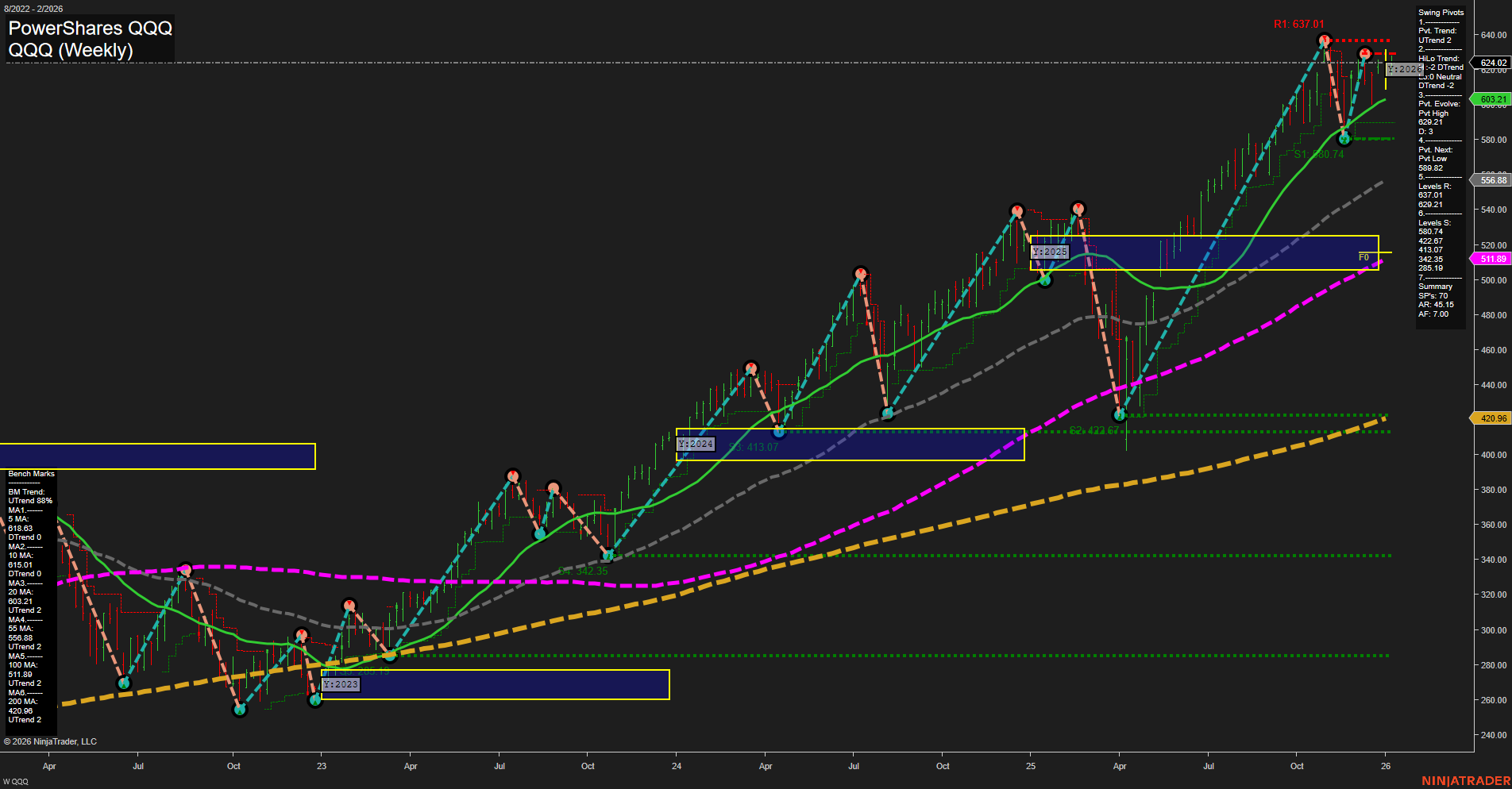 - NQ Above MSFG/WSFG, YSFG neutral, benchmarks strong, swing uptrend on daily, short/intermediate consolidation, key support 25161.00, resistance at recent highs, uptrend confirmed in moving averages.