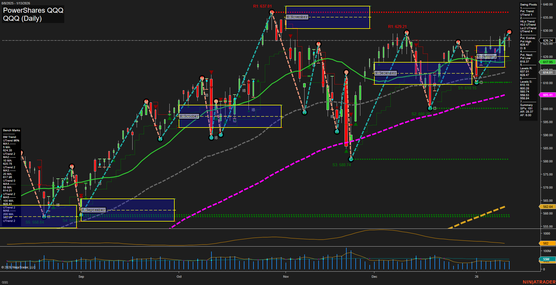 - QQQ: 619.55 Bearish (-1.07%) – Nasdaq-100 ETF experiencing sharper declines compared to large-caps.