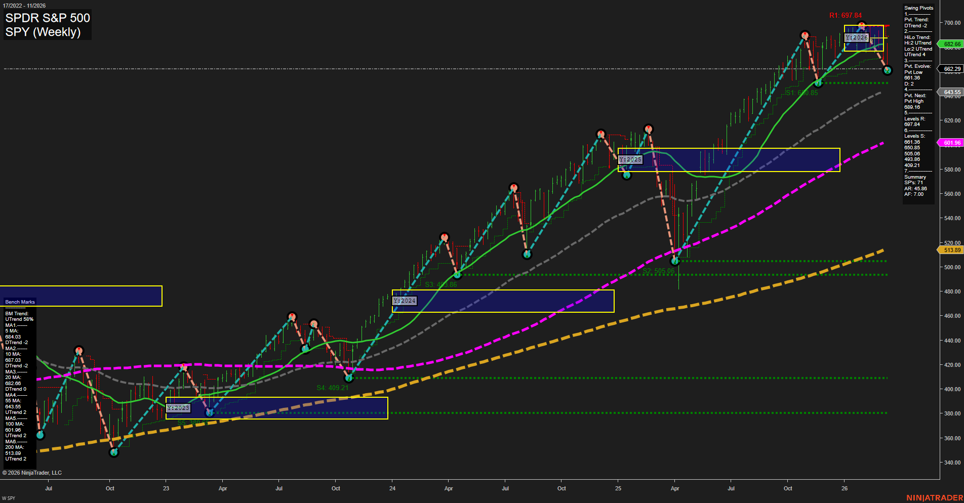 - ES Short-term WSFG trend up, price above NTZ center, swing pivots down, intermediate/long-term MSFG & YSFG down, above MA benchmarks, key resistance at 7092.75/6704, support at 6293.25/5319.46.