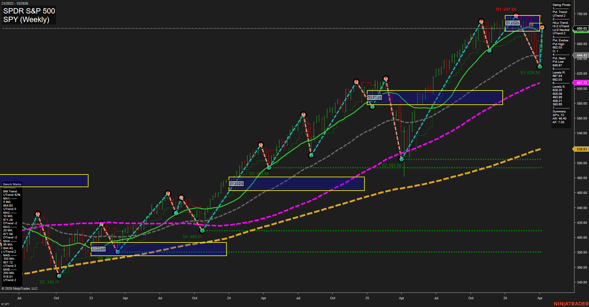 Summary of the current state of US Indices Futures based on higher time-frame (HTF) technical analysis as of: 2026-04-12: 18:15 CT.
