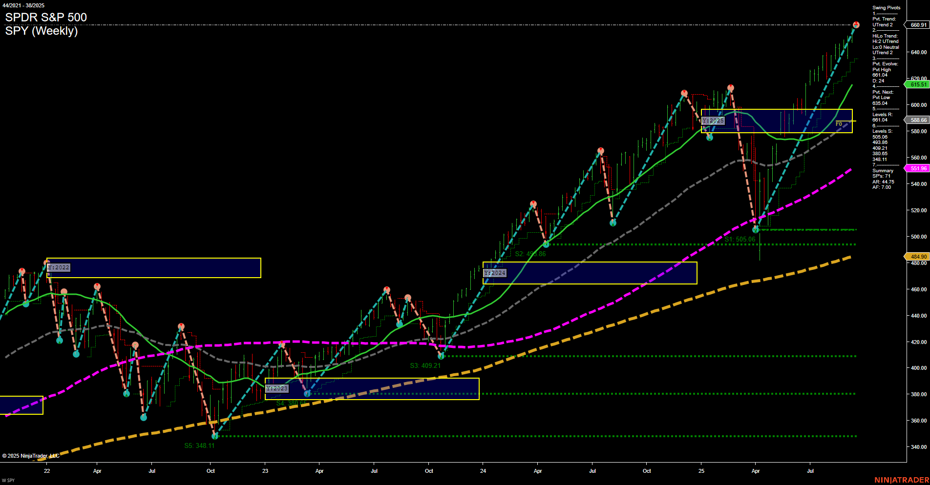 - ES Strong YSFG/MSFG/WSFG uptrends, price at highs, MAs all rising, latest swing high at 6688.25 (R), support at 6290.40, uptrend in all pivots, trend continuation phase.