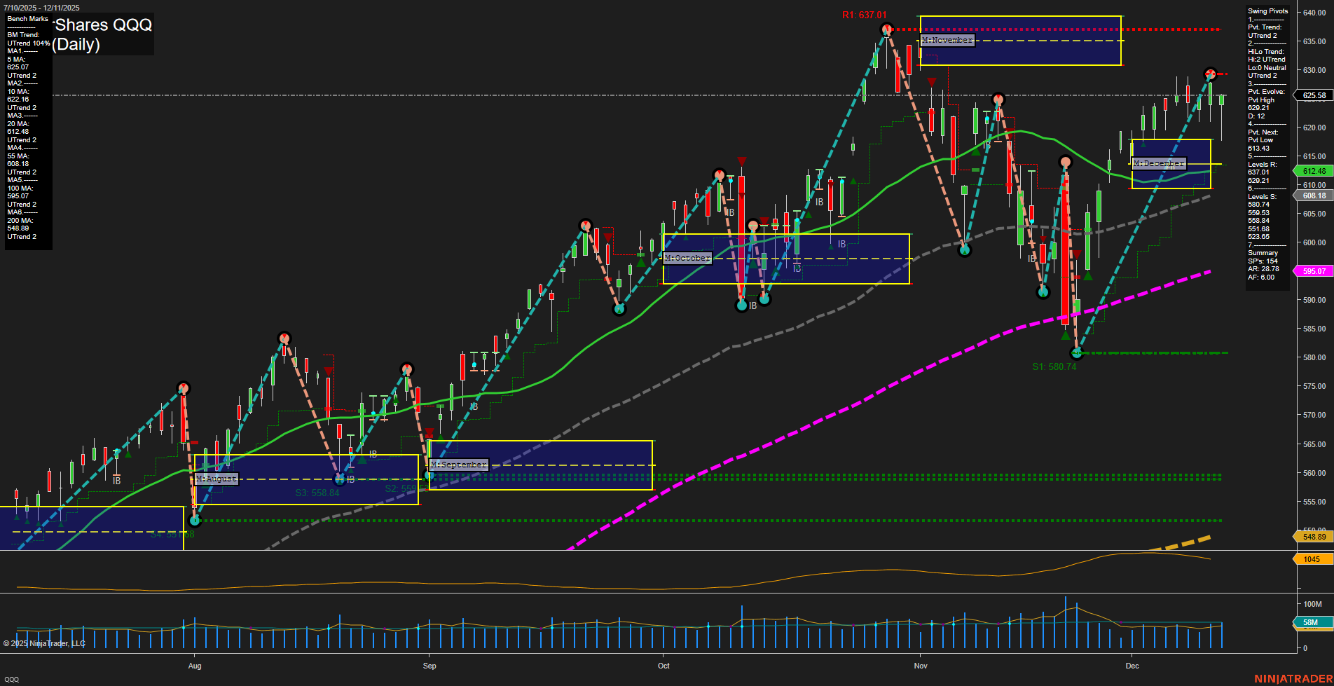 - QQQ: 613.62 — Bearing downward momentum (-1.91%).