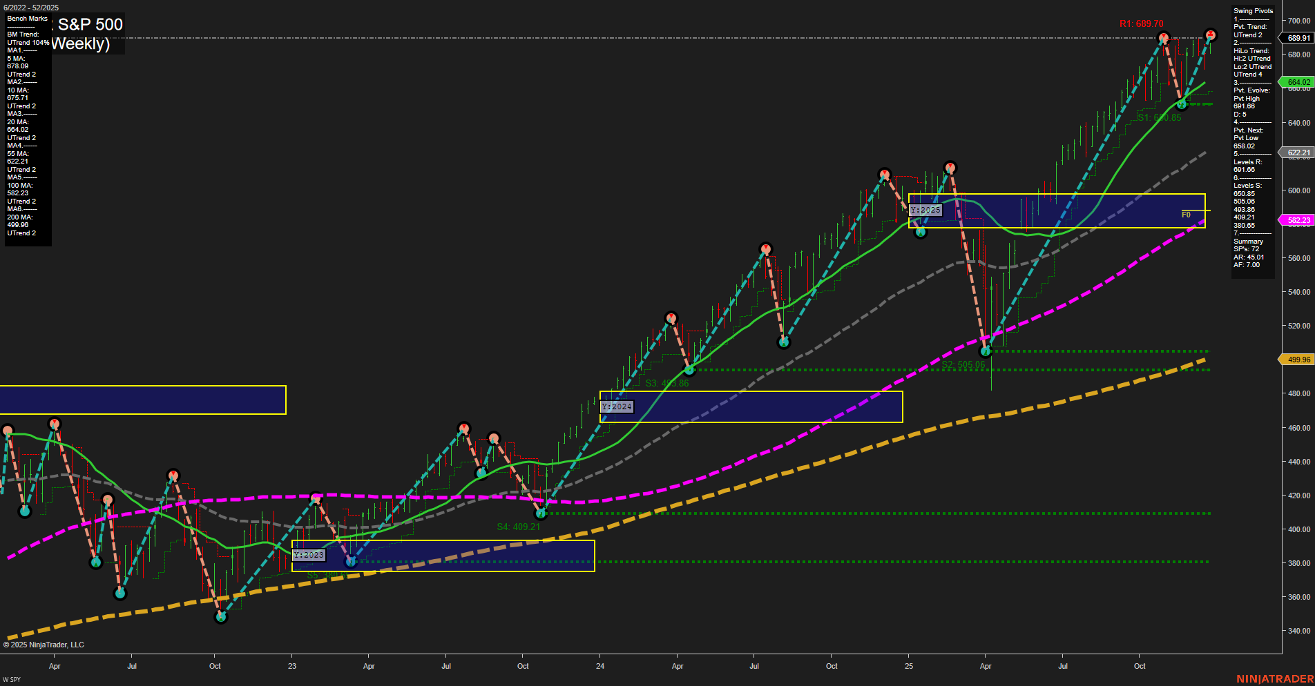 - ES Uptrend all HTFs, price above YSFG/MSFG/WSFG NTZ/F0% levels, above all benchmarks, swing highs at 7013–6980, support 6780–6840, higher highs/lows, S/R well defined.