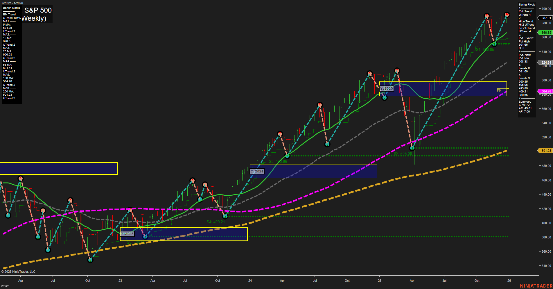 - ES YSFG/MSFG uptrend, WSFG short-term down, above major MA benchmarks, swing pivots: 7013.50 high resistance, 6780.54 key support, consolidation phase with HTF bullish structure.