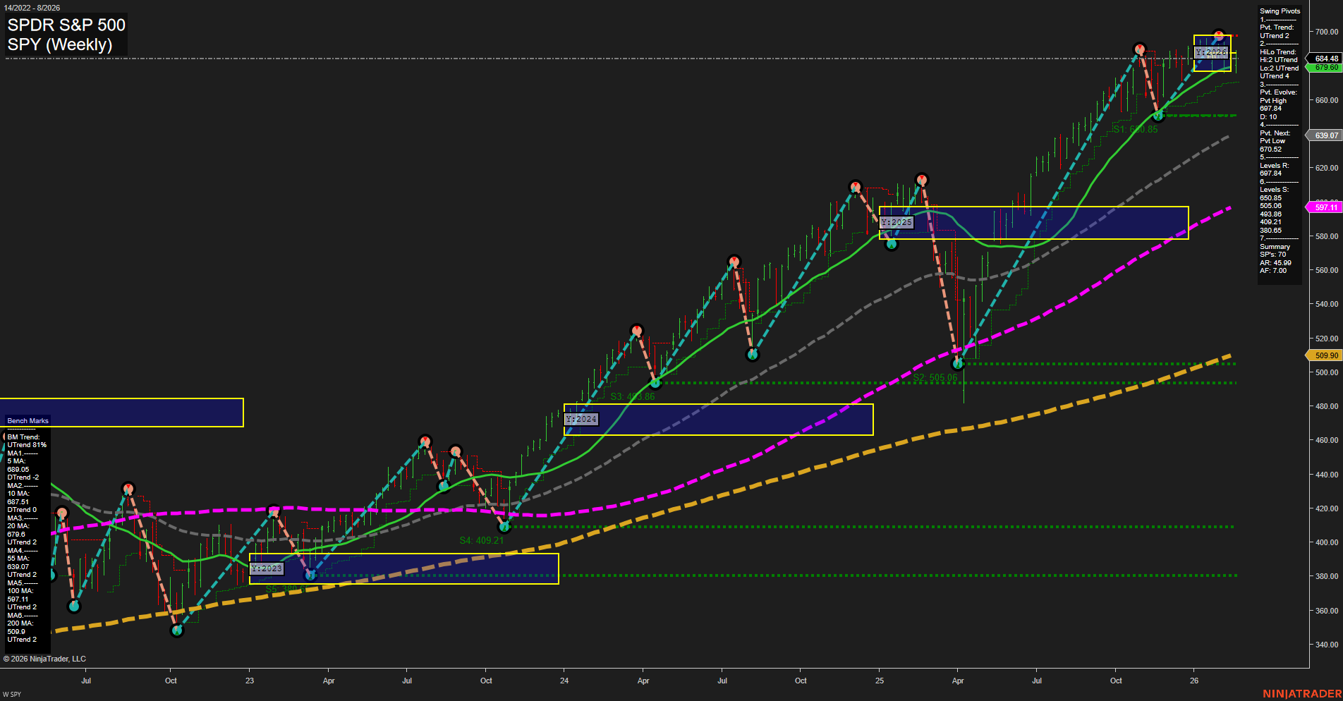 - RTY Bullish across YSFG, MSFG, WSFG, price above all major MAs, uptrend in swing pivots, current swing high 2749.2, support at 2558, sustained rally phase with higher highs/lows.