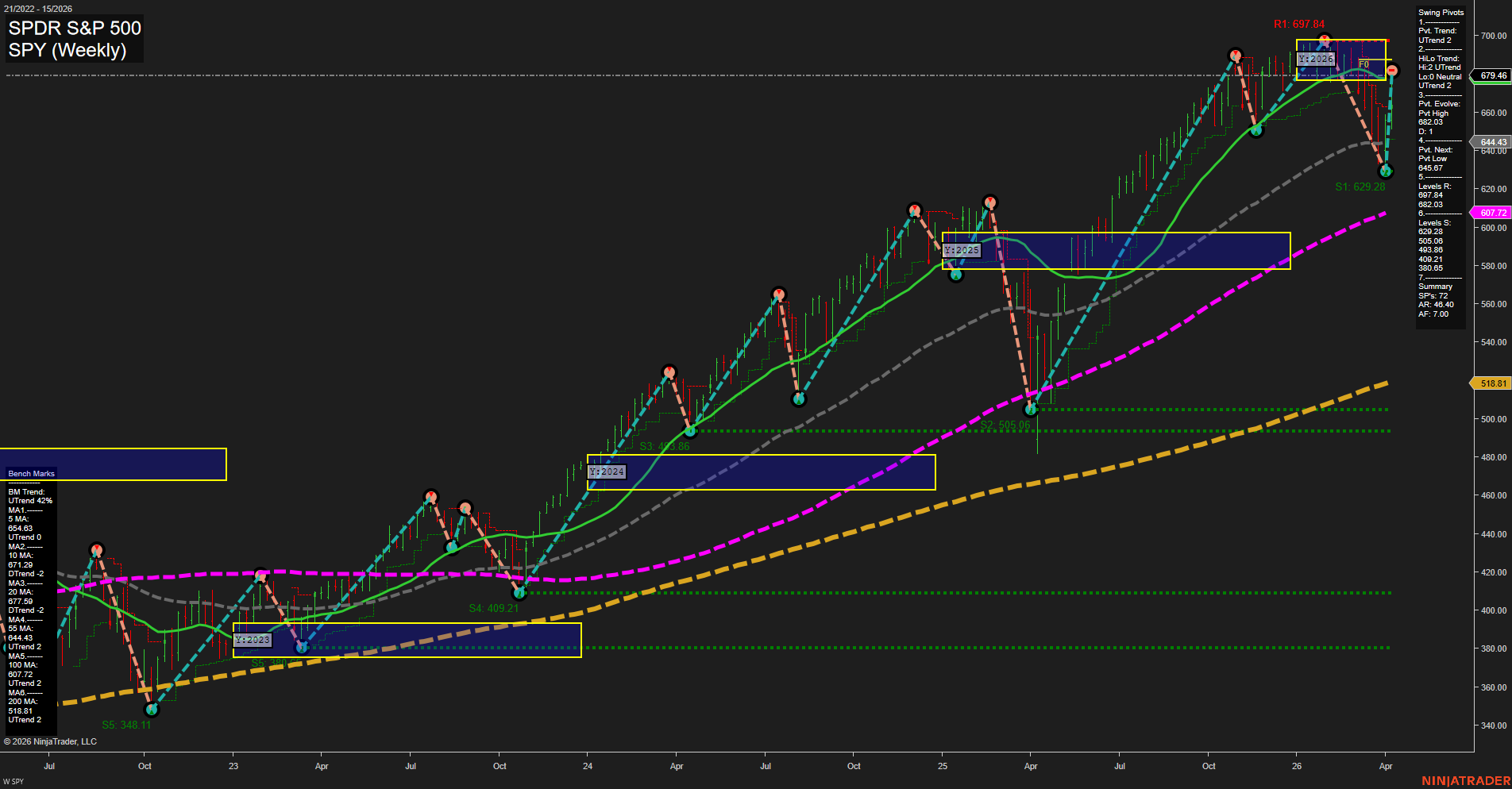 Summary of the current state of US Indices Futures based on higher time-frame (HTF) technical analysis as of: 2026-04-13: 07:16 CT.