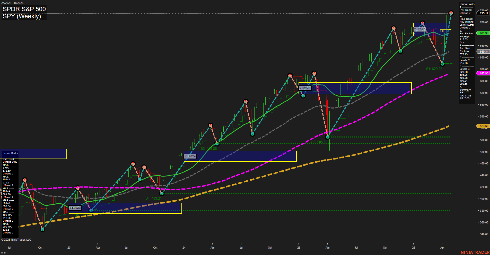 - ES Yearly/Monthly/Weekly session grids remain bullish overall; price at fresh weekly highs, above all benchmarks, UTrend pivots intact, resistance 7223.25, support below prior pivot shelves.